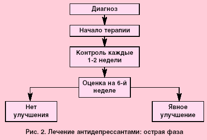 Как показано на схеме (рис. 2), адекватное лечение должно проводиться достаточно долго, чтобы оценить его эффективность. После начала лечения антидепрессантами следует назначать встречи с пациентом каждые 1-2 недели или чаще, если у него наблюдается тяжелая депрессия или требуется корректировка дозы трициклического антидепрессанта. Эффективность терапии (выраженное улучшение, отсутствие улучшения) оценивают каждые шесть недель, хотя реакция на лечение может быть и раньше.