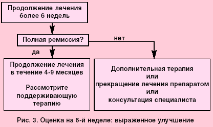 Если на шестой неделе наблюдается выраженное улучшение, медикаментозное лечение может быть продлено еще на шесть недель (рис. 3).