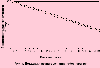 На рисунке 5 показана кумулятивная вероятность сохранения здоровья в течение пяти лет у пациентов, достигших выздоровления после большого депрессивного эпизода (Maj et al., 1992).