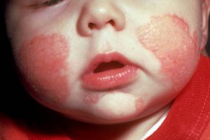 - Детская экзема - развивается у младенцев в возрасте до 1 года, чаще у детей на искусственном вскармливании с семейным анамнезом аллергических и атопических заболеваний. Типично нисходящее (начиная с щек и волосистой части головы) распространение экземы. Характерные проявления - красная, мокнущая кожа, корочки и чешуйки. Детская экзема часто связана с нарушением состава кишечной микрофлоры ребенка.