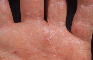 - Дисгидротическая экзема связана с нарушением нейроэндокринной регуляции и повышенной активностью потовых желез. Чаще поражает стопы и ладони, начинается на боковых поверхностях пальцев рук и ног. Отличается сильным зудом пораженной области и отсутствием покраснения кожи (гиперемии). Симптомы интенсифицируются в жаркое время года, при перегревании и сильных стрессах.