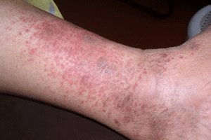 - Варикозная экзема возникает на фоне хронической венозной недостаточности, к которой нередко приводит варикозная болезнь вен. Характерные симптомы красные пятна и сыпи на фоне потемневшей кожи нижних конечностей. Типичная локализация - нижняя часть голени.