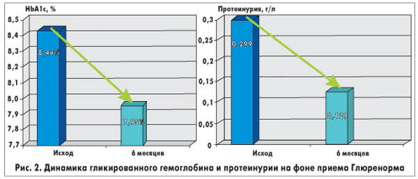 Группа больных состояла из 19 мужчин и 37 женщин в возрасте от 43 лет до 81 года. Длительность заболевания — от 1 до 30 лет. Динамика гликированного гемоглобина и протеинурии представлена на рисунке 2.