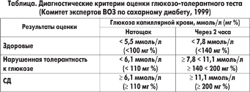 Критерии оценки глюкозо-толерантного теста у взрослых приведены в таблице.