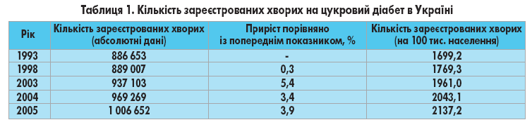 Станом на 1.01.2006 р. в Україні кількість зареєстрованих хворих на ЦД перевищила мільйонну позначку і досягла 1 006 652 особи, що становить 2137,2 випадку на 100 тис. населення (табл. 1).