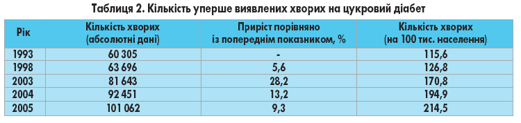 В Україні, як і у світі, також спостерігається значне зростання захворюваності населення на ЦД: у 1993 р. було зареєстровано 115,6 на 100 тис. населення, а в 2005 р. – 214,6 (табл. 2).