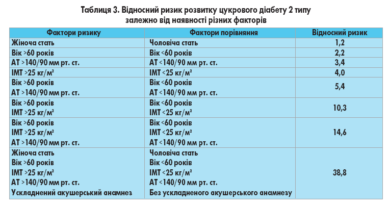 Серед осіб із нормальним АТ частота виявлення ЦД була низькою – 0,6%, що в 2,4 разу менше порівняно із середнім показником серед усіх обстежених (р<0,01). Поширеність ПТГ становила 0,61%, що в 1,3 разу менше за середній показник (р<0,01). Серед осіб із незначним підвищенням АТ поширеність ЦД у 10, а ПТГ – у 5 разів перевищувала аналогічні показники в обстежених із нормальним АТ. Нами спостерігалося значне підвищення показників поширеності ЦД при переході від нормального АТ до помірної артеріальної гіпертензії – більше ніж у 3 рази (1,87%), прогресивне збільшення цього показника до 2,21% у групі пацієнтів із артеріальною гіпертензією II ступеня, що в 3,7 разу вище, ніж в осіб із нормальним АТ (р<0,01). Поширеність ПТГ серед осіб із нормотензією і помірною артеріальною гіпертензією вірогідно не розрізнялася (0,6 і 0,68% відповідно), однак різке, майже дворазове збільшення цього показника було виявлено в осіб із систолічним АТ >160 мм рт. ст. і/або діастолічним АТ >100 мм рт. ст. (р<0,01). В осіб, які мали обтяжену щодо ЦД спадковість, поширеність ЦД була в 1,6, ПТГ – у 1,3 разу вище, ніж за відсутності позитивного сімейного анамнезу (р<0,01). Частота виявлення ЦД у жінок із ускладненим акушерським анамнезом була в 2,2, а ПТГ – у 1,7 разу вища, ніж за його відсутності (р<0,01). Показники відносного ризику розвитку ЦД 2 типу при найрозповсюдженіших комбінаціях факторів наведено в таблиці 3.