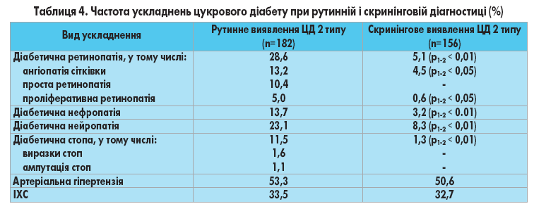 Порівняння поширеності судинних ускладнень ЦД, виявлених під час проведення скринінгової і рутинної (за зверненням) діагностики захворювання, здійснювалося на основі ретроспективного аналізу амбулаторних карт 387 пацієнтів із уперше виявленим ЦД 2 типу.