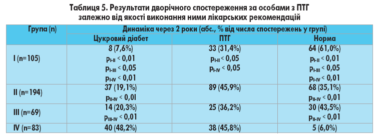 Наслідки ПТГ у зазначених групах відрізнялися: у групі I частота розвитку ЦД була вірогідно нижчою, ніж у решти (табл. 5). У цій групі нормалізація вуглеводного обміну спостерігалася в 10,2 разу частіше, ніж у групі IV. Часткове виконання рекомендацій було менш ефективним – відновлення нормального вуглеводного обміну в групах II і III відзначалося рідше, ніж у групі I, у 1,7 і 1,4 разу відповідно. Достовірних відмінностей у осіб, у яких збереглося ПТГ через 2 роки спостереження, у групах ІІ-IV не виявлено, у той час як у групі I цей показник був мінімальним і вірогідно відрізнявся від такого в групах II і IV.