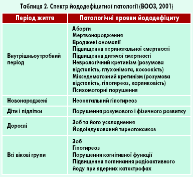ЙДЗ – це всі патологічні стани, що розвиваються в популяції унаслідок йодного дефіциту і яким можна запобігти при нормальному споживанні йоду (табл. 2).