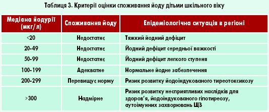 Екскреція йоду з сечею розглядається як основний епідеміологічний показник, що характеризує йодне забезпечення певного регіону. Цей показник є високочутливим, швидко реагує на зміни в споживанні йоду і має найважливіше значення не лише для оцінки епідеміологічної ситуації, а й для здійснення контролю програм профілактики ЙДЗ (табл. 3).
