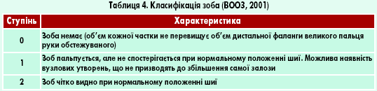 Існують різні етіологічні чинники дифузного еутиреоїдного зоба (зобогенні речовини, дефект синтезу ТГ, початкові прояви автоімунного тиреоїдиту), проте найчастішою його причиною (понад 95% випадків) є йодний дефіцит. Оскільки переважна частина території України через геохімічні та інші умови потерпає від нестачі йоду, під час діагностики еутиреоїдного збільшення ЩЗ необхідно насамперед підозрювати йододефіцитний ендемічний зоб. При цьому гіпертрофія і гіперплазія ЩЗ носять компенсаторний характер і спрямовані на забезпечення організму ТГ. Оцінку ступеня збільшення ЩЗ методом пальпації за рекомендаціями ВООЗ наведено в таблиці 4.