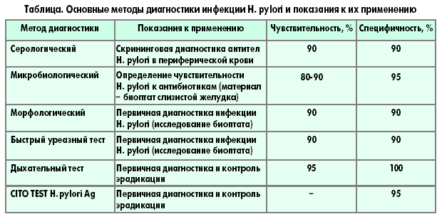 Для определения тактики лечения пациентов с вышеперечисленными заболеваниями важной диагностической задачей является подтверждение или опровержение наличия инфицирования H. рylori. Такая диагностика проводится различными методами, которые отличаются чувствительностью и специфичностью и имеют свои показания к применению (табл.).