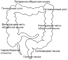 Толстая кишка начинается от илеоцекального отверстия и баугиниевой заслонки и заканчивается анальным отверстием. В толстой кишке различаются четыре отдела: слепая кишка с червеобразным отростком; ободочная кишка, в свою очередь подразделяющаяся на восходящий, поперечный и нисходящий отделы; сигмовидная и прямая кишки .