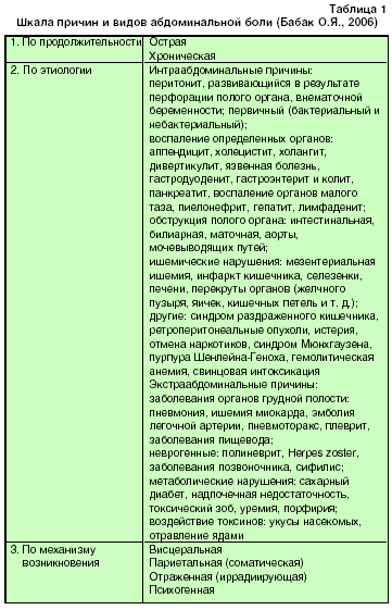 Прежде чем приступить к рассмотрению дифференциальной диагностики, следует обратить внимание на причины и виды абдоминальной боли (табл. 1).