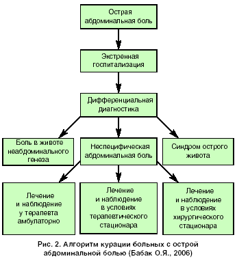 Итак, симптом острой боли всегда рассматривается как ургентный, по крайней мере до тех пор, пока не будет опровергнута или подтверждена острая хирургическая патология. Ответ на вопрос, где хирург, а где терапевт, при синдроме острой абдоминальной боли схематично представлен на рис. 2.