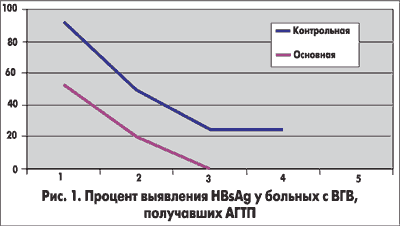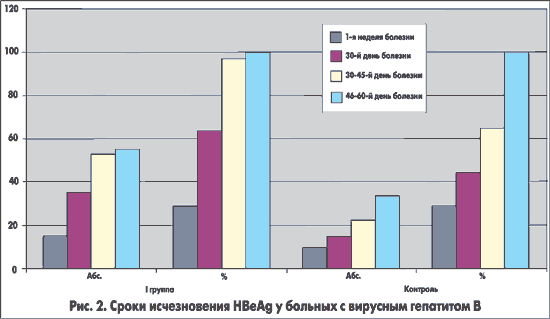 Контрольные осмотры всех пациентов с ОВГВ при динамическом наблюдении показали затянувшуюся реконвалесценцию у больных, не принимающих антигомотоксическую терапию. У большинства пациентов контрольной группы HBsAg обнаруживался на протяжении 45 дней. У части больных этот антиген можно было встретить на 60-й и 90-й день наблюдения (рис. 1).