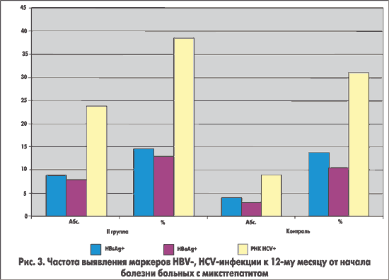 При анализе частоты выявления маркеров HBV-, HCV-инфекции к 12-му месяцу от начала наблюдения у больных с микстгепатитом В+С (рис. 3) констатировано, что у 38 больных (61,3%) основной группы и 20 больных (68,9%) контрольной группы в течение полугода после проведенной терапии РНК HCV элиминировала из организма. При этом РНК HCV определялась практически всегда, если имел место подъем АлАТ выше, чем в 2 раза. У некоторых больных вирусемия отмечалась при нормальных биохимических показателях. У части больных после первого снижения уровня АлАТ отмечался феномен «мнимого выздоровления», а затем вновь регистрировалась гиперферментемия. Пациенты с длительностью гиперферментемии более 6 месяцев и с повторными подъемами АлАТ после его предыдущего снижения уровня до нормы, а также при активной репликации HCV даже при нормальных показателях трансаминаз на основании общепринятых критериев были отнесены к группе больных хроническим гепатитом С.