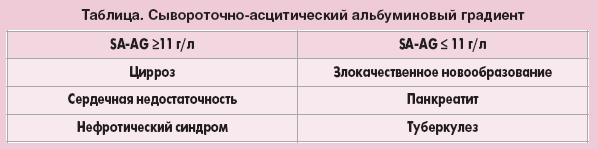 В диагностике асцита высокую диагностическую ценность (точность 97%) имеет сывороточно-асцитический альбуминовый градиент (SA-AG), представляющий собой разницу между концентрацией альбумина в сыворотке и асцитической жидкости (таблица).