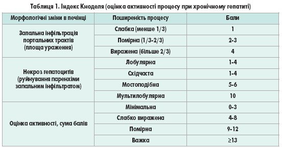 Важливий фактор фіброгенезу – постійна активність хронічного вірусного гепатиту, що визначається на підставі морфологічних критеріїв: вираженості некрозу гепатоцитів і ознак запалення (інфільтрація тканини клітинними елементами). Для широкої клінічної практики запропоновано напівкількісний гістологічний критерій – індекс Кноделя. Оцінка проводиться в балах (табл. 1).