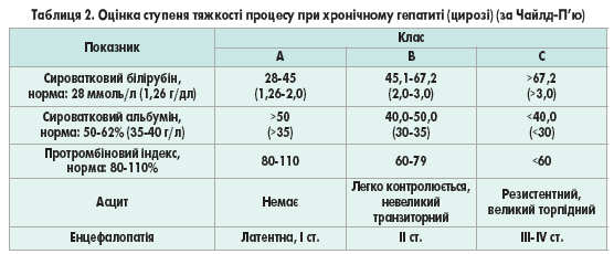 Для клініциста, крім етіологічних факторів, надзвичайно важливим є визначення тяжкості стану хворого, що оцінюється за шкалою Чайлд-П’ю з використанням доступних клінічних та лабораторних критеріїв: наявності та ступеня вираженості асциту, печінкової енцефалопатії сироваткового білірубіну, протромбінового індексу, сироваткового альбуміну (табл. 2).