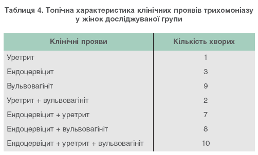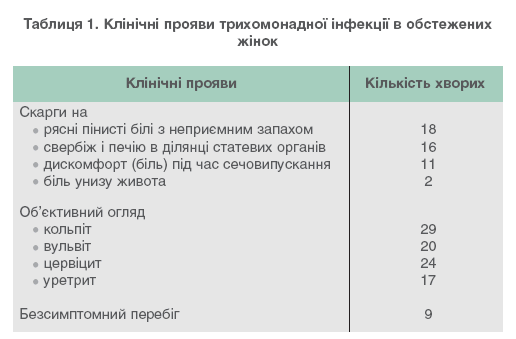 Клінічна картина захворювання в обстежених жінок була різноманітною (табл. 1). Всі вони були обстежені як статеві партнери хворих на трихомоніаз чоловіків або звернулися самостійно для проведення медичного огляду. При гінекологічному огляді спостерігались явища різного ступеня вираженості.