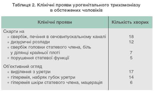 У чоловіків трихомоніаз найчастіше проявлявся у вигляді уретриту (табл. 2). Суб’єктивні відчуття були непостійні і слабо виражені. При об’єктивному огляді спостерігалися мізерні водянисті, слизисті або слизисто-гнійні виділення, симптоми баланопоститу. Хворі скаржилися на свербіж головки статевого члена, помірний біль у ділянці крайньої плоті, виділення з препуціального мішечка. Під час огляду відмічалися гіперемія шкіри головки статевого члена і крайньої плоті, набряк, мацерація шкіри, подекуди з утворенням ерозій. В одного хворого діагностовано хронічний трихомонадний простатит.