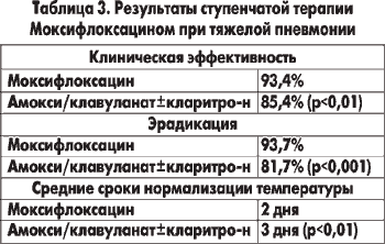 В рандомизированном контролируемом исследовании (Finch et al., 2002) из 625 пациентов с тяжелой внебольничной пневмонией, требующей стартовой парентеральной терапии, одна группа получала моксифлоксацин (400 мг в/в — 400 мг внутрь), другая — амоксициллин/клавуланат (1,2 г 3 раза в сутки в/в — 625 мг 3 раза в сутки внутрь) +/- кларитромицин (в/в или внутрь). Результаты представлены в табл. 3.