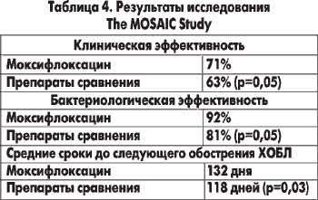 Доказана эффективность моксифлоксацина при хроническом бронхите. Было проведено многоцентровое проспективное рандомизированное двойное слепое сравнительное исследование (The MOSAIC Study) эффективности моксифлоксацина и стандартных режимов терапии у пациентов с обострением хронического бронхита. В исследуемой группе больные получали моксифлоксацин 400 мг 1 раз в сутки 5 дней, в группах сравнения — или амоксициллин 500 мг 3 раза в сутки 7 дней, или кларитромицин 500 мг 2 раза в сутки 7 дней, или цефуроксим 250 мг 2 раза в сутки 7 дней. Результаты The MOSAIC Study, показанные в табл. 4, позволяют сделать следующие выводы: