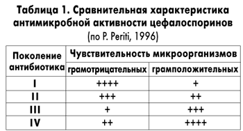 Наиболее удачна классификация цефалоспоринов, в которой учтен спектр антимикробной активности препаратов (табл. 1). В каждом поколении (генерации) цефалоспоринов выделяется препарат-прототип, свойства которого используются при создании новых соединений: І поколение — цефазолин, ІІ — цефуроксим, ІІІ — цефотаксим, ІV — цефепим.