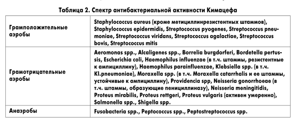 Являясь наиболее характерным представителем ІІ поколения цефалоспоринов, Кимацеф резистентен к действию β-лактамаз H.influenzae, N.gonorrhoeae, отдельных представителей семейства Enterobacteriaceae (E.coli, Proteus mirabilis, Klebsiella spp., Citrobacter freundii). В отличие от цефалоспоринов І поколения, Кимацеф более активен в отношении S.pneumoniae и S.pyogenes. Это единственный представитель цефалоспоринов ІІ поколения, проникающий в цереброспинальную жидкость (табл. 2).