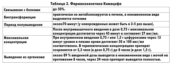 Фармакокинетические свойства Кимацефа позволяют использовать антибиотик для парентерального введения при лечении тяжелых инфекций различных органов и систем организма. При внутримышечном или внутривенном введении Кимацефа в дозе 750 мг в течение нескольких минут достигается высокая концентрация антибиотика в сыворотке крови, которая сохраняется выше минимальной ингибирующей для чувствительных микроорганизмов не менее 8 часов. За счет того, что препарат в незначительной степени связывается с белками плазмы, большая часть введенной дозы находится в крови в активной форме. Терапевтически активные концентрации Кимацефа достигаются в бронхиальном секрете, легких, желчи, мышечной ткани, в мягких тканях, в костной ткани, в синовиальной жидкости, в амниотической жидкости и органах репродуктивной сферы. При воспалении мозговых оболочек, а также после травм головного мозга терапевтические концентрации препарата создаются в спинномозговой жидкости (табл. 3).