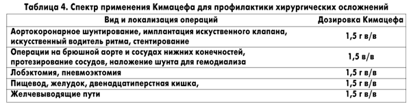 Кимацеф характеризуется активностью in vitro в отношении широкого спектра грамположительных и грамотрицательных бактерий, он устойчив к гидролизу под влиянием большинства β-лактамаз, продуцируемых бактериями. Антибактериальная активность препарата in vitro определяет его клиническую эффективность — Кимацеф можно с успехом применять при лечении широкого спектра инфекций, таких как инфекции верхних и нижних дыхательных путей, мочевыводящих путей, гинекологические, кожи и мягких тканей, костей и суставов, центральной нервной системы, в т. ч. менингит, септицемия и гонорея. Проведенные в последние годы экспериментальные и клинические исследования убедительно показали, что рациональное проведение антибиотикопрофилактики в определенных ситуациях позволяет снизить частоту послеоперационных инфекционных осложнений с 20-40% до 1,5-5% [3]. Покрывая антибактериальным действием большинство аэробов и анаэробов, вызывающих периоперационные осложнения, Кимацеф может быть использован практически во всех сферах хирургии, как надежный препарат для профилактики инфекционных осложнений (табл. 4).