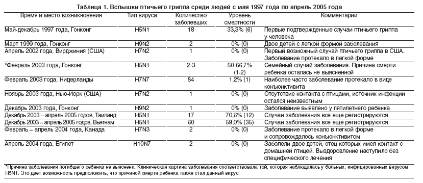 Все типы вирусов птичьего гриппа, вызывавшие заболевание у человека с 1997 года, представлены в таблице 1 [3]. По состоянию на 1 ноября 2005 года в Таиланде, Вьетнаме, Индонезии и Камбодже зарегистрировано 124 случая заболевания людей, 63 из которых закончились летально.