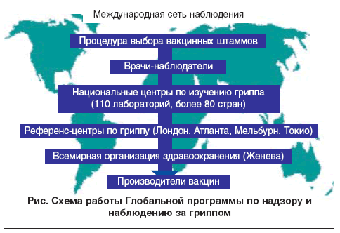 Эксперты ВОЗ пришли к единому мнению, что пандемия гриппа неизбежна [5]. В связи с этим в 2001 году эта организация способствовала созданию и развитию Глобальной программы по надзору и наблюдению за гриппом (Global Agenda for Influenza Surveillance and Control). В Программу включены свыше 100 лабораторий из разных стран, которые формируют международную сеть по изучению гриппа (см. рис.) [8].