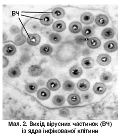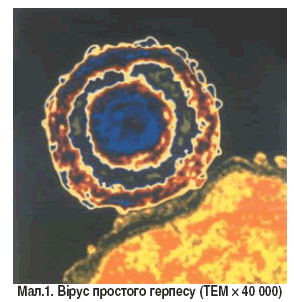 Вперше ВПГ винайшов W. Groter у 1912 р., але до 1960 р. не були відомі етіологічні та клінічні критерії різновидів (двох типів) герпесу [13]. Це ДНК-вміщуючі віруси групи Herpes viridae величиною 150-200 нм. Віріон складається із центрально розташованого щільного нуклеотиду, білкової капсули у формі ікосаедра (капсиду) та зовнішньої оболонки. Остання має неправильну форму, містить 2 шари ліпідів, глікопротеїди та інші структури, котрі в антигенному відношенні є близькими до подібних речовин на клітинах господаря (мал. 1).