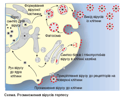 Пожиттєва персистенція герпес-вірусів зумовлена їхньою унікальною властивістю до інкорпорації своїх ДНК у нейрони регіонарних гангліїв чутливих нервів периферичної нервової системи, що перешкоджає імунному нагляду за антигенами (АГ) даних агентів [7]. ВПГ здатні до реактивації протягом усього життя людини (реплікування зі створенням інфекційного потомства за сприятливих умов). Вони потрапляють до лімфо- чи кровотоку, контактують з імунними клітинами, спонукаючи останніх до синтезу інтерферонів (ІФН), інших цитокінів, специфічних протигерпесних вірусонейтралізуючих антитіл (АТ) та ін. Однак біологічна еволюція цих патогенів дозволяє їм під час активної репродукції уникати розпізнавання за рахунок створення білків-блокаторів рецепторів лімфоцитів, зайнятих координацією сили і напряму імунних реакцій (СD4+-клітин), що може викликати відстрочку чи/та хаотичність процесів протигерпетичного спротиву. Перехід до повномасштабної реплікації (реактивація) відображає втрату чи часткову неповноцінність імунологічного контролю організму щодо вірусної інфекції.