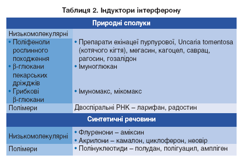 Оскільки вибір імуномодулятора, тривалість лікувальних та профілактичних курсів імунотерапії повинні узгоджуватися з даними особистого імунологічного статусу пацієнта, на початку лікування слід проконсультувати хворого у клінічного імунолога, особливо це стосується пацієнтів із торпідним щодо антивірусних препаратів перебігом інфекції, наявністю генералізованих клінічних форм захворювання або формуванням ускладнень. Класифікацію препаратів, що на сьогодні призначають найчастіше – індукторів інтерферону, наведено у таблиці 2.