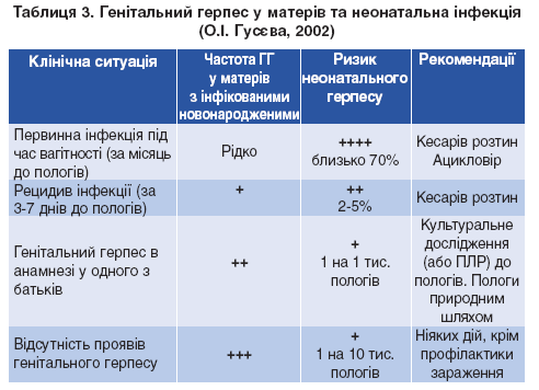 За кордоном за наявності гострої стадії герпетичної інфекції вагітним пропонують приймати препарати ацикловіра per os та застосовувати їх місцево, а також незалежно від наявності клінічних симптомів проводити 2-тижневий профілактичний курс ацикловіром по 200 мг 4 рази на день напередодні пологів, що десятикратно знижує ризик інфікованості плода або новонародженого і дозволяє уникнути операції кесаревого розтину (коли відсутні інші показання до її здійснення) [1]. Крім того, подібну профілактику проводять при передчасних пологах та безводному періоді терміном понад 6 годин. За останні роки подібну тактику ведення хворих на ВПГ-інфекцію вагітних жінок опановує все більше російських спеціалістів [6, 11] (табл. 3).
