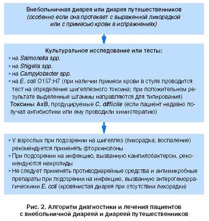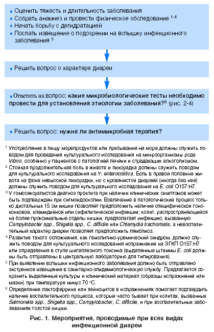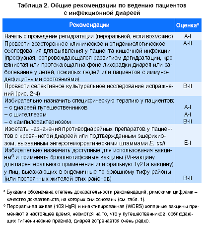 Данные рекомендации касаются таких вопросов, как оральная регидратация, клиническое и эпидемиологическое обследования пациента, проведение селективных бактериологических исследований испражнений, избирательное назначение антимикробной терапии, противопоказания к применению противодиарейных препаратов, использование доступных специфических вакцин (табл. 2, рис. 1, 2, 3, 4).
