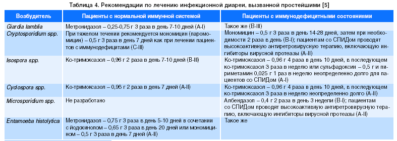 Диарея с выраженными признаками воспаления (присутствие крови, гноя, слизи и лейкоцитов в фекалиях), сопровождающаяся лихорадкой, скорее всего, вызвана патогенами, в отношении которых назначение этиотропных препаратов может обеспечить клинический и бактериологический эффекты. В таблицах 3 и 4 изложены основные рекомендации по применению антибиотиков при инфекционной диарее. Эмпирическая антимикробная терапия в случае спорадического возникновения диареи с лихорадкой и признаками воспаления в фекалиях предполагает назначение фторхинолонов (норфлоксацин по 0,4 г каждые 12 ч в течение 3-5 дней, или ципрофлоксацин в дозе 0,5 г каждые 12 ч на протяжении 3-5 дней, или офлоксацин по 0,2 г каждые 12 ч в течение 3-5 дней) [6].