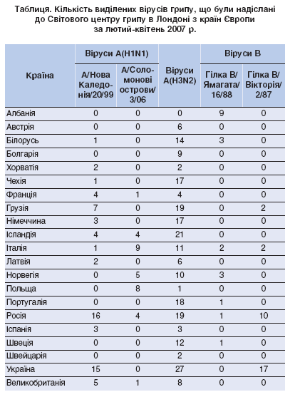 Отже, з таблиці видно, що Україна в епідемічному сезоні грипу 2006-2007 рр. представила для вивчення достатню кількість виділених вірусів, що, безумовно, буде враховано при прийнятті рішення про склад грипозних вакцин на наступний епідемічний сезон 2008-2009 рр.