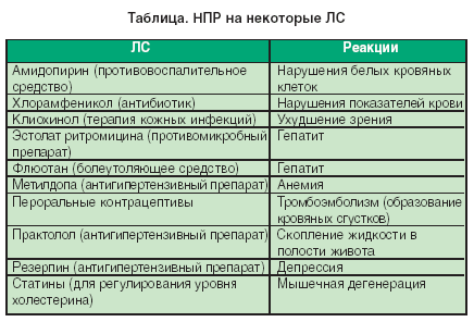 Вредные побочные действия обычно называют неблагоприятными побочными реакциями (НПР) на ЛС. Классические примеры НПР представлены в таблице.