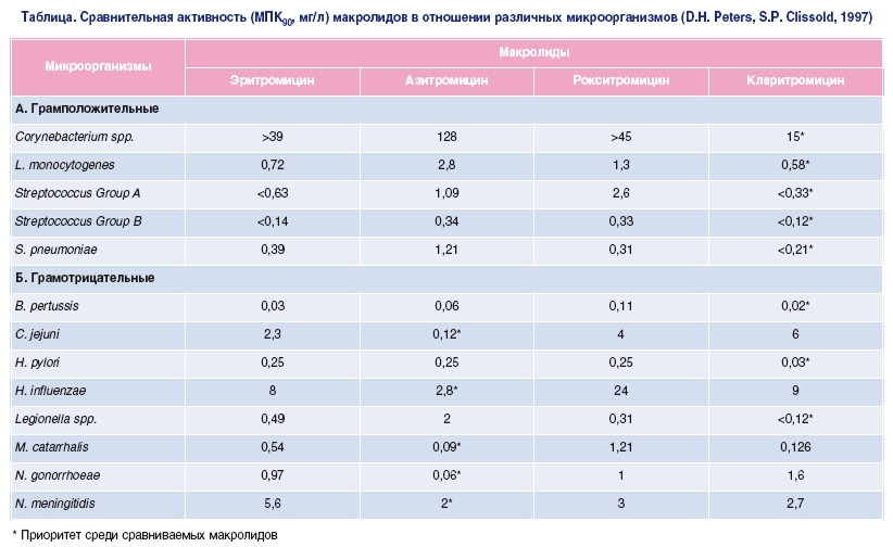 По антимикробной активности группа макролидов является неоднородной (таблица).