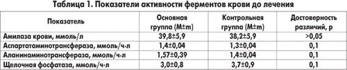 Таблица 1. Показатели активности ферментов крови до лечения