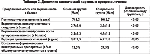 Влияния на психотическую симптоматику у обследуемой группы больных выявлено не было. Положительное влияние на астеническую симптоматику, острый психоорганический синдром, очевидно, связаны с выраженным ноотропным действием и уменьшением действия экзогенных и эндогенных токсических факторов. Гепатопротекторное и ноотропное действие препарата позволяет применять большие дозы психотропных препаратов, что облегчает оказание помощи больным в состоянии алкогольного делирия.