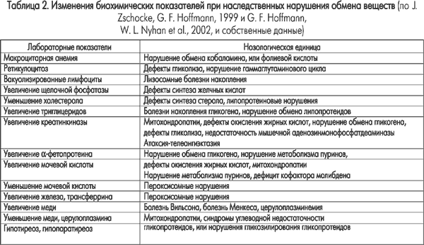 В процессе медико-генетического консультирования семей (до 30 000 семей в год) показана высокая информативность традиционных биохимических исследований, прочитанных с позиций метаболических болезней (табл. 2).