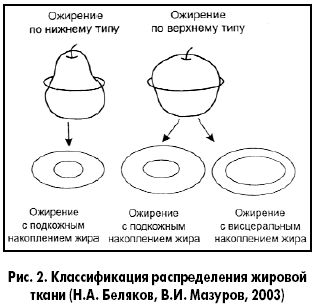 На рисунке 2 представлены типы распределения жировой ткани с учетом окружности талии и основанная на оценке этих особенностей классификация. Ожирение по верхнему типу представлено двумя подтипами, однако установлено, что абдоминальный тип распределения жира зачастую ассоциируется с чрезмерным накоплением висцерального жира.