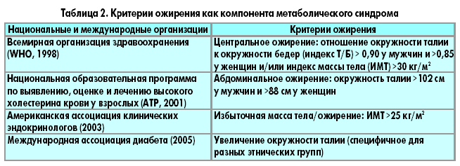 Если проанализировать классификации метаболического синдрома, представленные экспертами различных медицинских ассоциаций, то обращает на себя внимание то, что ожирению по степени важности отведены определенные места. Так, в классификации Всемирной организации здравоохранения на первом месте располагаются нарушения углеводного обмена (сахарный диабет, изменения толерантности к глюкозе, инсулинорезистентность, выявленная по методу НОМА), а такой фактор, как ожирение, занимает четвертое место. В остальных трех последующих классификациях ожирение стоит на первом месте в перечне компонентов МС. В трех классификациях из четырех первостепенное значение придается именно абдоминальному ожирению, которое имеет различные количественные характеристики окружности талии, причем предложенные критерии достаточно строги. Более того, на международной конференции по предиабету и МС в Берлине (2005) эти требования были ужесточены, размеры окружности талии в качестве норматива уменьшены.