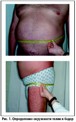 В качестве критерия в них выступает показатель соотношения окружности талии (ОТ) и окружности бедер (ОБ). Окружность талии измеряется на середине расстояния от нижнего края реберной дуги до гребня подвздошной кости, окружность бедер – на уровне вертелов бедренных костей (рис. 1). Результаты исследований последних лет показали, что надежным признаком избыточного накопления жировой ткани в абдоминальной области является величина окружности талии при ИМТ <35.